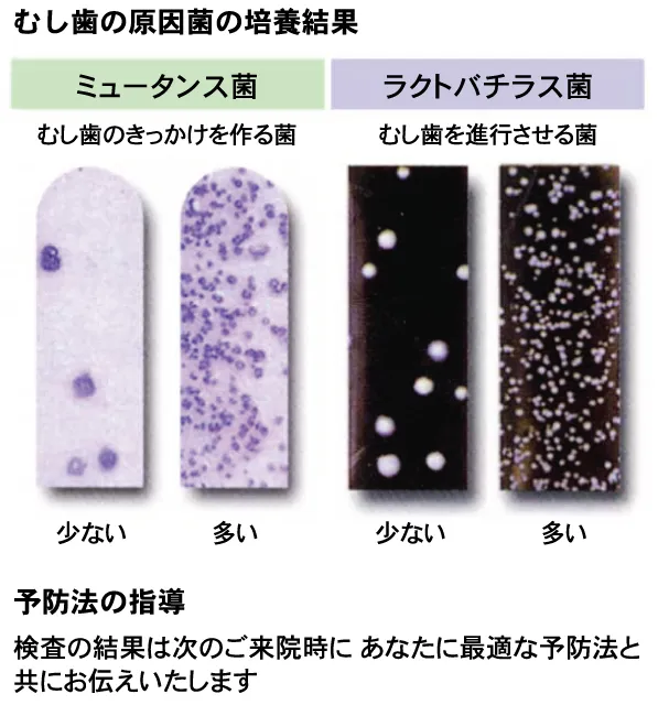 検査棒を舌にあて だ液からむし歯菌を検出し どんな菌が多いのかを調べます