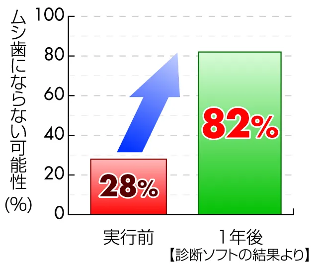 もし今あなたがむし歯にやりやすかったとしても これから先 むし歯にならない可能性をグラフのように大幅に高めることができます