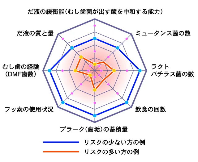 それぞれの価が中心に集まるほど虫歯や歯周病のリスクが高いといえます
