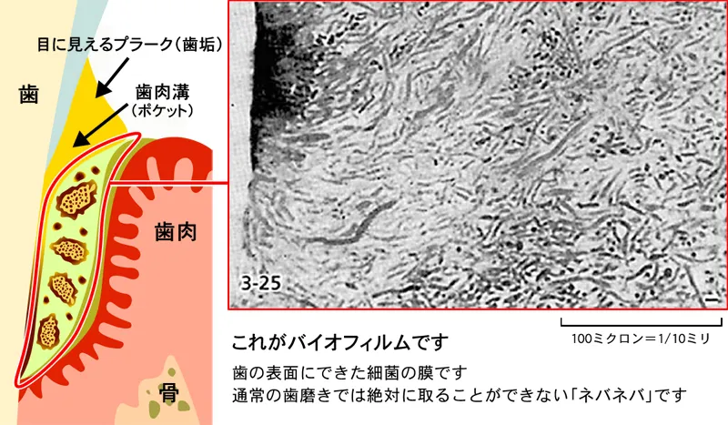歯ブラシでは落ちない歯垢(バイオフィルム)があることが分かってきました。
