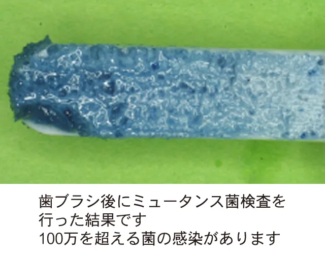 唾液検査で調べている、虫歯の原因菌です。ミュータンス菌と呼ばれ、このは、ひょっとしたらこの菌がたくさん存在しているかもしれません。菌だけは、歯みがきで落とすことができないことが研究で分かりました。つまり、一生懸命歯みがきしているのに虫歯ができやすい方がいるのです。